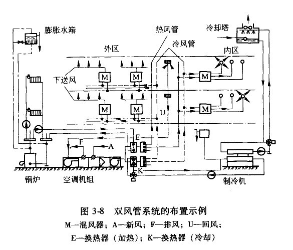 圖3-8表示了一個完整的(包括冷熱源)的雙風管空調(diào)系統(tǒng)的布置情況,通常因混合箱價格較高,所以有時以幾個風口或一個區(qū)采用一個混合箱,混合箱后采用普通的低速風管和送風口。