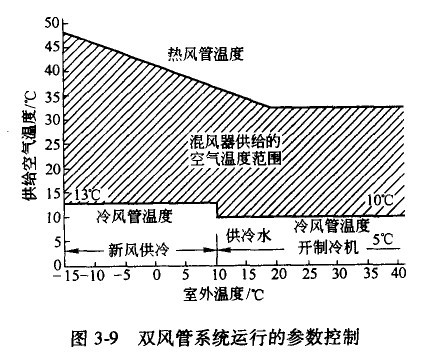 當設計雙風管空調(diào)系統(tǒng)時,通??捎孟铝袛?shù)據(jù):冷風溫度全年為12 - 15℃;夏季熱風溫度僅比室溫高3℃;冬季熱風溫度為35—45℃,過渡季熱風溫度為25_35℃。圖3.9為雙風管系統(tǒng)全年運行時冷熱風等溫度參數(shù)控制的一例。設計風管時,冷風量按總風量的100%計算,熱風量按總風量的50%一70%考慮。故一般用高速系統(tǒng)送風以減小風管斷面尺寸。此外,為了減少雙風管系統(tǒng)的運轉費用,也已開發(fā)了雙風管可變風量系統(tǒng),這不僅要求混合箱具備變風量功能,而且送風機的風量亦應予以控制,初投資將高于定風量系統(tǒng)。