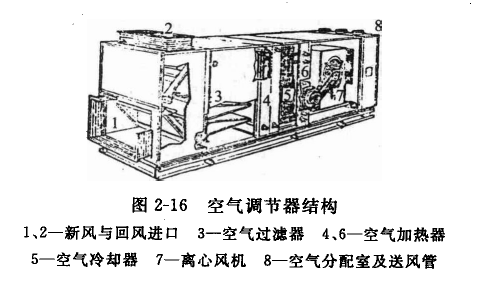 空氣調節(jié)器又稱空調器,其作用是完成對空氣的處理,以滿足空調所要求的空氣送風溫度、濕度、速度、清潔度??照{器主要由空氣混合室、空氣過濾器、加熱器、加濕器、冷卻器、擋水板、空氣分配室、消音室和風機等組成,如圖2-16所示。