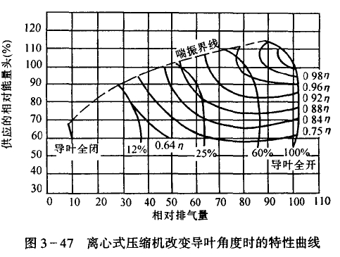 葉輪所產(chǎn)生的能量頭就有變化,從而改變了壓縮機(jī)的特性曲線。圖3-47表示了離心式壓縮機(jī)不同導(dǎo)葉開度時(shí)的特性曲線。從圖上看到,要保持相同的能量頭,制冷量將隨著導(dǎo)葉的關(guān)閉而下降。這種調(diào)節(jié)方法在氟利昂離心式壓縮機(jī)中普遍得到采用。其合理的詞節(jié)范圍比較寬(30%~100%),容易實(shí)現(xiàn)自動(dòng)調(diào)節(jié),經(jīng)濟(jì)性好。