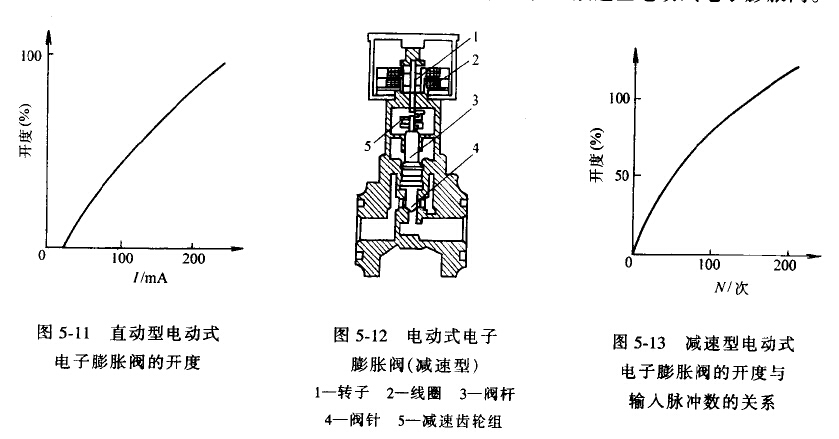 2)減速型 其結(jié)構(gòu)如圖5-12所示。減速型電動式電子膨脹周內(nèi)裝有減速齒輪組。步進電動機通過減速齒輪組5將其磁力矩傳遞給閥針4。減速齒輪組起放大磁力矩的作用,因而配有減速齒輪組的步迸電動機可以方便地與不同規(guī)格的閥體配合,滿足不同調(diào)節(jié)范圍的需要。減速型電動式電子膨脹閥的開度特性見圖5-13。