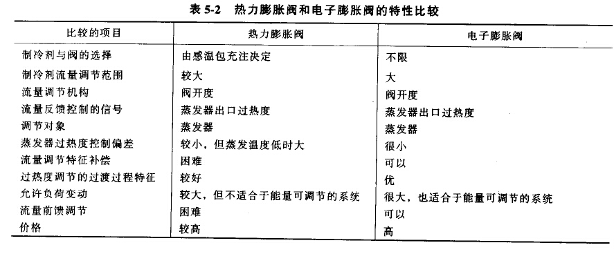 在表5-2中列出了熱力膨脹閥及電子膨脹閥的性能和特點比較。