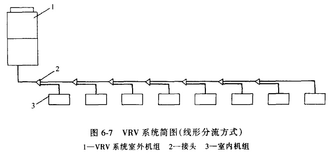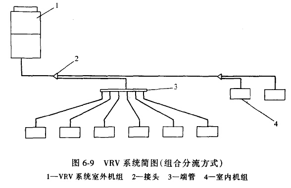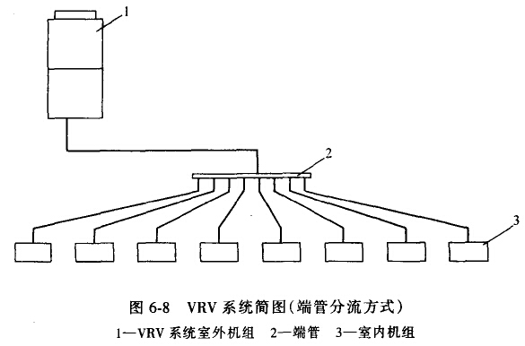 VRV系統(tǒng)是一種風冷直接蒸發(fā)制冷和制熱的空調(diào)系統(tǒng),由一臺或一組室外機和多臺室內(nèi)機,通過制冷劑管道及專用管道配件連接而成。系統(tǒng)制冷劑流量可隨室內(nèi)負荷的變化而變化,部分負荷下機組COP值高達4.0以上,室外機按額定功率分為3750W、6000W、7500W(5匹、8匹、10匹)三種。一臺額定功率為3750W的室外機,最多可拖8臺室內(nèi)機。一臺額定功率為6000W的室外機,最多可拖13臺室內(nèi)機。一臺額定功率為7500W的室外機,最多可拖16臺室內(nèi)機。每臺室內(nèi)機均可以單獨運行和進行室溫控制。典型的系統(tǒng)見圖6-7至圖6-9(室外機額定功率為3750W)。