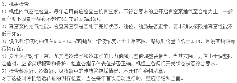 在制冷機(jī)組啟動(dòng)運(yùn)轉(zhuǎn)前,要求對制冷機(jī)組脫離輔助設(shè)備的狀況進(jìn)行一番檢查,方能啟動(dòng)制冷機(jī)組運(yùn)轉(zhuǎn)。