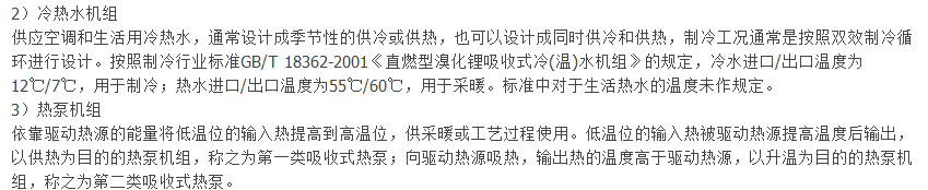 供應(yīng)空調(diào)用冷水或工藝用冷卻水,按照單效或雙效制冷循環(huán)工作,是目前主要生產(chǎn)的機(jī)型。按照制冷行業(yè)標(biāo)準(zhǔn)GB/T 18431-2001《蒸汽和熱水型溴化鋰吸收式冷水機(jī)組》的規(guī)定,冷水出口溫度分為7℃、10℃和13℃三個級別。其中7℃用于降溫除濕,10℃和13℃只能用于降溫冷卻。