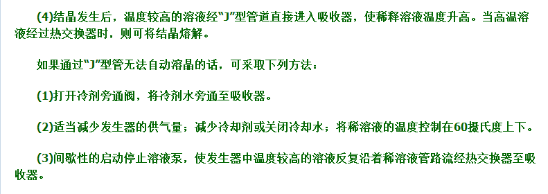 溴化鋰溶液結(jié)晶是冷水機(jī)常見(jiàn)的故障之一,“J”型管發(fā)燙是結(jié)晶的標(biāo)志,那么溴化鋰溶液結(jié)晶是什么原因呢?如果無(wú)法自動(dòng)溶晶的話可有什么辦法解決呢?下面由小編簡(jiǎn)單說(shuō)說(shuō)吧: