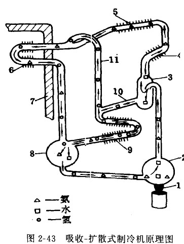 圖2-43為吸收一擴(kuò)散式制冷機(jī)的原理圖,系統(tǒng)中充注三組分注工質(zhì)制冷劑氨,吸收劑水,擴(kuò)散劑氫。整個(gè)系統(tǒng)中沒(méi)有機(jī)械運(yùn)動(dòng)部件,也不需要任何機(jī)械能驅(qū)動(dòng),只要提供適當(dāng)?shù)臒嵩?,就能使系統(tǒng)中的工質(zhì)不斷循環(huán),經(jīng)過(guò)吸熱和放熱過(guò)程而產(chǎn)生制冷效果。因此,它可以作為吸收式冰箱的制冷機(jī)組,制成無(wú)噪音,無(wú)振動(dòng)的家用冰箱。