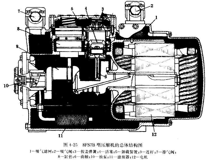 半封閉式壓縮機同開啟式壓縮機相比較,具有結(jié)構(gòu)緊湊、體積小、重量輕的特點。以如圖4-25所示的8FS7B型壓縮機為例,半封閉式與開啟式在結(jié)構(gòu)上最明顯的區(qū)別在于電動機殼體和壓縮機機體是鑄在一起的,內(nèi)腔相通,不需要軸封,避免軸封漏泄的弊病,并且還可利用吸入的低壓低溫制冷劑蒸氣來冷卻電機繞組,改善電動機的冷卻條件,減少電動機的電耗,提高電動機的出力。而且壓縮機與電動機之間取消了聯(lián)軸器,縮短了機組的軸向尺寸。所以,目前50mm和70mm缸徑的系列壓縮機多數(shù)都制成半封閉式。70mm缸徑的系列產(chǎn)品中,四缸以上的均設(shè)有能量調(diào)節(jié)裝性。在半封閉式壓縮機中,潤滑油應(yīng)考慮到不論壓縮機正轉(zhuǎn)或反轉(zhuǎn)都能正常供油,所以多數(shù)采用月牙型內(nèi)嚙合齒輪油泵。