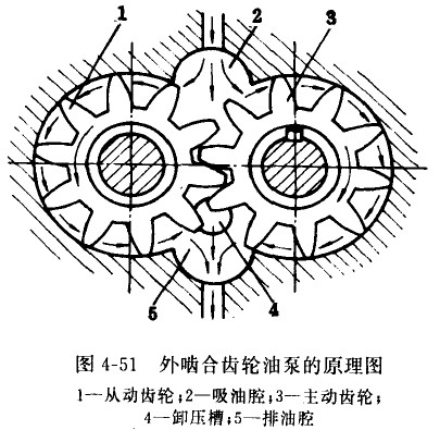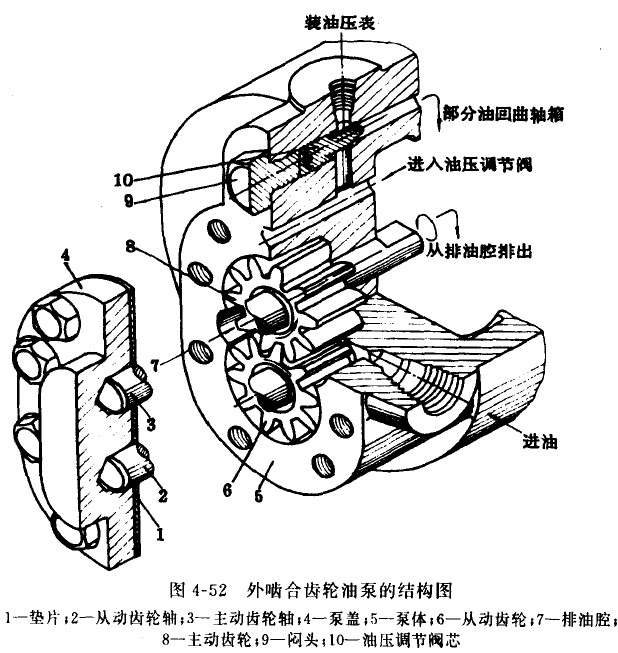 圖4-51是外嚙合齒輪油泵的工作原理圖。2FIO,4FIO機(jī)均用此種油泵。油泵的殼體內(nèi)有兩個(gè)互相嚙合的同直徑外齒輪,齒輪與殼體內(nèi)腔之間具有很小的徑向間隙和端面間隙,因此,齒間凹谷與泵體內(nèi)壁形成許多貯油空間。當(dāng)曲軸帶動(dòng)主動(dòng)齒輪旋轉(zhuǎn)時(shí),這些空間隨之移動(dòng),于是,充滿空間的潤(rùn)滑油就從吸油腔二邊被送到排油腔一邊,并源源不斷地被向外排出。中間相互嚙合的齒面實(shí)際上就是吸油腔與排油腔之間的密封面。當(dāng)齒間凹谷與對(duì)應(yīng)齒輪進(jìn)入完全嚙合,形成一密封空間時(shí),為避免其中留存的潤(rùn)滑油受到強(qiáng)烈地壓擠,在殼體端面上開(kāi)有卸壓槽,以便讓留存的潤(rùn)滑油由此泄出。圖4-52是這種油泵的結(jié)構(gòu)圖,它的供油壓力可以用轉(zhuǎn)動(dòng)油壓調(diào)節(jié)閥芯,改變旁通油道的通道截面來(lái)予以調(diào)整。順時(shí)針向里旋轉(zhuǎn)為油壓升高,反之,則油壓降低。