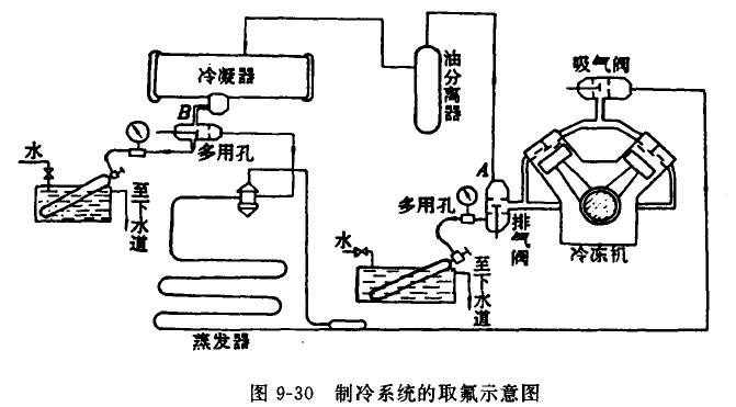 (5)隨著系統(tǒng)內氟利昂的減少,高壓壓力就會降低,因此在B處取氟將會十分困難,可以換在A處取氟。利用A處取氟,應調節(jié)冷凍機吸入截止閥之大小,以排氣壓力不超過0.98MPa為宜。