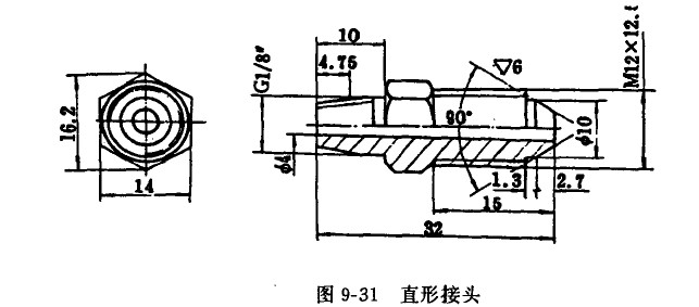 (1)將氟壓縮機排氣閥和冷凝器出液閥開足,此時氟截止閥B處多通用孔即被關閉,取下堵頭,按堵頭尺寸加工T形或直形接頭(直形接頭可參考圖9-31進行加工),依照圖9-30接好取氟管(一般用奪6×l紫銅管作成)。