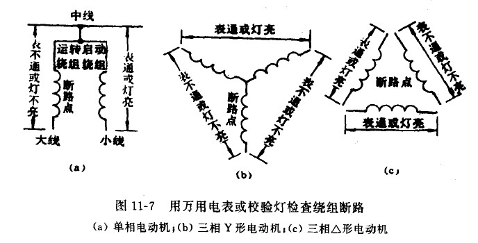 檢查單相或三相電動(dòng)機(jī)斷路時(shí),可用兆歐表或用萬(wàn)用電表(放在低電阻檔)、校驗(yàn)燈來(lái)校驗(yàn)(見(jiàn)圖11-7)。對(duì)于星形接法的電動(dòng)機(jī),檢查時(shí)需每相分別測(cè)試I對(duì)于三角形接法的電動(dòng)機(jī),檢查時(shí)必須把三相繞組的接線頭拆開(kāi)后,再每相分別測(cè)試。測(cè)試時(shí),哪一相表不通或燈不亮即為這相斷路。泵殼內(nèi)斷路需剖開(kāi)泵殼檢修。