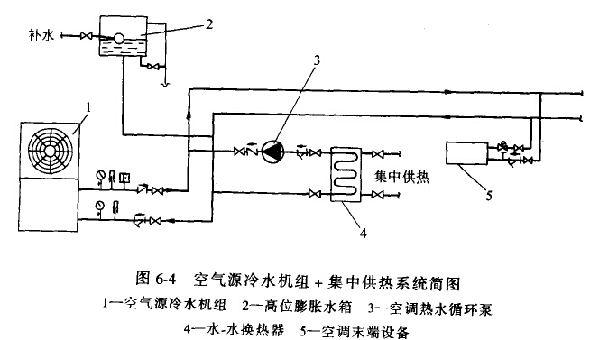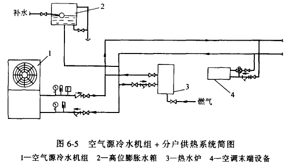 (1)供冷系統(tǒng)與供暖系統(tǒng)完全獨立 供冷系統(tǒng)主機(jī)為空氣源冷水機(jī)組,末端為風(fēng)機(jī)盤管;供暖系統(tǒng)熱源一般為集中供熱和分戶供熱,末端設(shè)備為散熱器或低溫輻射地板、壁板。集中供熱方式有城市熱網(wǎng)、小區(qū)鍋爐房集中供熱和大樓鍋爐供熱等,分戶供熱方式主要有燃?xì)狻⑷加蜔崴疇t和電熱水爐等。