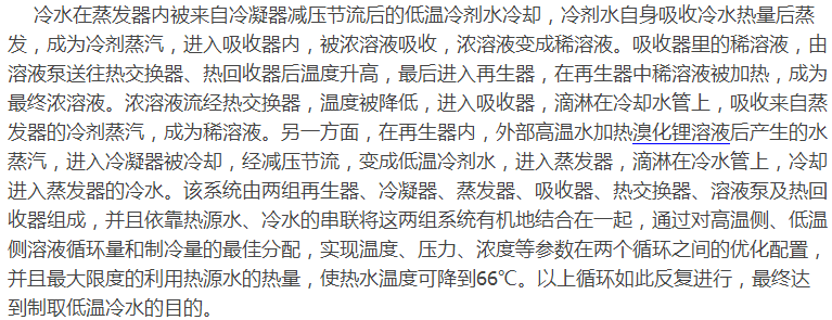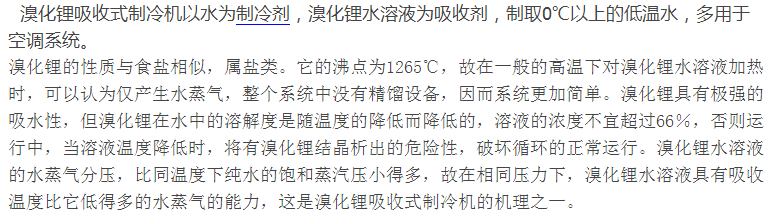 由于溴化鋰吸收式制冷機(jī)是以水為制冷劑,所以無毒、無刺激性、不燃不爆,對(duì)環(huán)境沒有污染。