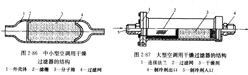 (1)小型空調(diào)用干燥過濾器的結(jié)構(gòu)如圖2-86所示,其外形為圓筒形,一端設(shè)置濾柵,另一端設(shè)銅質(zhì)過濾網(wǎng),兩端之間充滿干燥劑分子篩。干燥過濾器通常安裝在冷凝器之后、節(jié)流元件之前,如節(jié)流元件為毛細(xì)管,則焊接時(shí)毛細(xì)管插入干燥過濾器深度約為20mm,如插入太深會碰到過濾網(wǎng),堵塞毛細(xì)管。干燥劑分子篩的吸附能力會隨使用時(shí)間逐漸下降,甚至不起作用,因而需要定期更換。