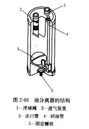 雎縮機(jī)的潤滑是靠從曲軸箱或其他油容器循環(huán)流動的潤滑油來實(shí)現(xiàn)的。當(dāng)系統(tǒng)運(yùn)行時(shí),潤滑油與制冷劑混合而成的高壓蒸氣由壓縮機(jī)進(jìn)入排氣管。如果僅有少。星潤滑油隨制冷劑在系統(tǒng)中循環(huán),并不會影響系統(tǒng)的性能。但是如果制冷劑中混有過多的潤滑油進(jìn)入系統(tǒng),將會降低蒸發(fā)器和冷凝器的換熱效率,同時(shí)影響系統(tǒng)中流量控制部件的正常工作。通過設(shè)置油分離器,可以減少系統(tǒng)中的油循環(huán)量。油分離器的結(jié)構(gòu)如圖2-88所示,當(dāng)制冷劑氣體被壓縮機(jī)排出時(shí),油隨著氣體進(jìn)入排氣管,通過進(jìn)氣裝置進(jìn)入油分離器,由于速度降低,使油與氣分離,制冷刺氣體通過出口管進(jìn)入冷凝器,而當(dāng)?shù)撞窟_(dá)到一定油位時(shí),浮球閥打開,油通過回油管進(jìn)入壓縮機(jī)。
