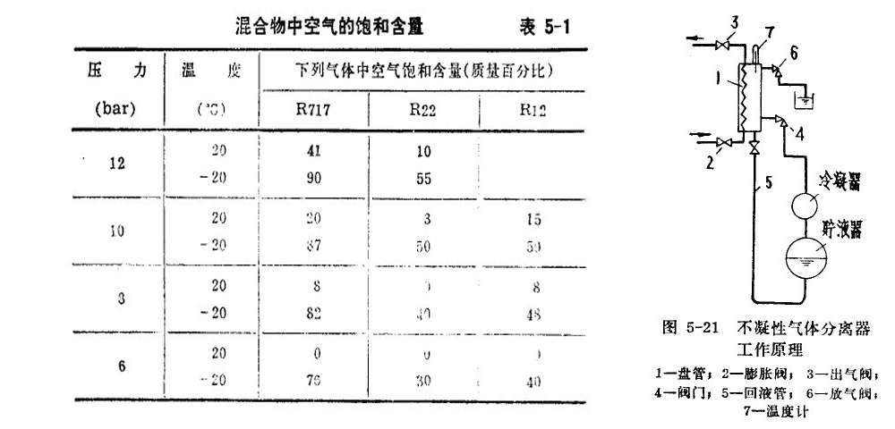 但是,如何既放出空氣而又能減少制冷劑的損失呢?這需要了解氣態(tài)制冷劑和空氣混合物中,空氣的飽和含量與壓力、溫度的關系。表5-1中給出了幾種氣態(tài)制冷劑中空氣飽和含量與壓力、溫度的關系,從表中可以看出,壓力越高,溫度越低,氣態(tài)制冷劑和空氣的混合物中空氣的質量百分比越大。也就是說,在高壓低溫條件下放空氣時,損失的制冷荊最少。不凝性氣體分離器就是保證在高壓和低溫條件下放空氣的設備。