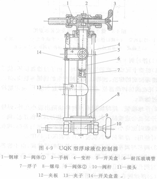 UQK型浮球液位控制器如圖4-9所示。它可以實(shí)現(xiàn)遠(yuǎn)距離控制液位及就地顯示液位。UQK-41型為短浮球.,用于油氨并存容器中的油位控制與放油。UQK-42型亦為短浮球,用于冷凍機(jī)的油位控制。UQK4-3型為長(zhǎng)浮球,用于氨中間冷卻器、臥式貯液器的液位指示控制。