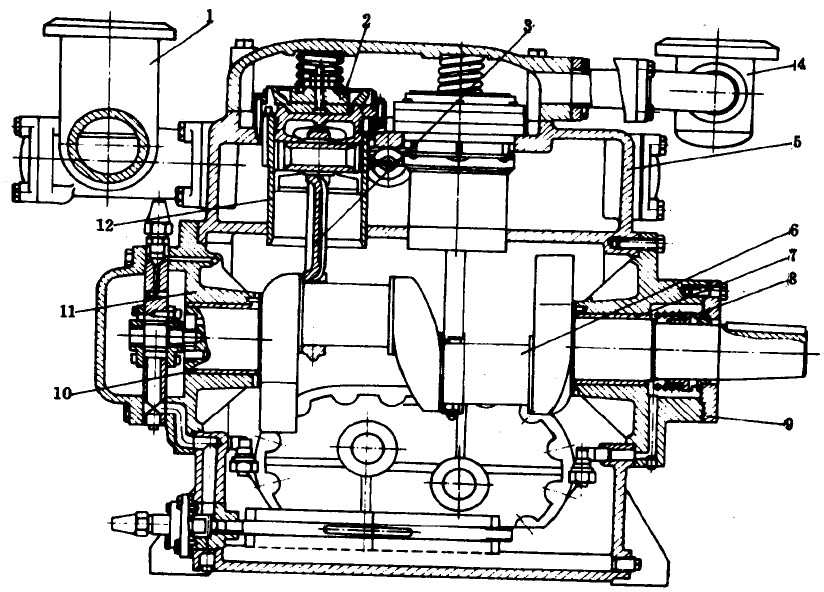 壓縮機(jī)采用壓力潤(rùn)滑,由軸后端轉(zhuǎn)子式油泵供油。潤(rùn)滑油從曲軸箱底部經(jīng)濾油器進(jìn)入油泵,加壓后從曲軸兩端進(jìn)入潤(rùn)滑油道。