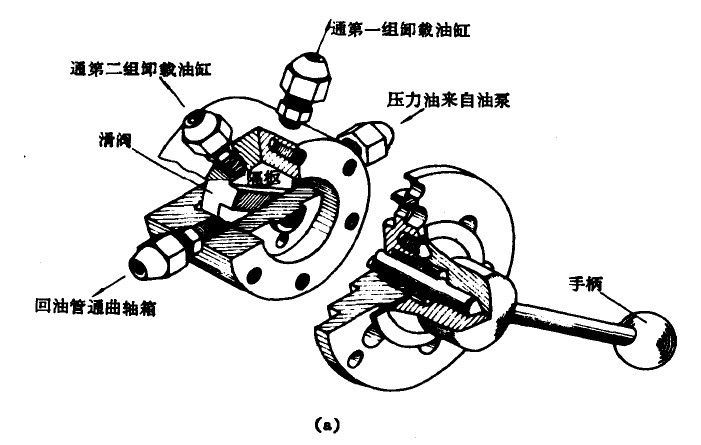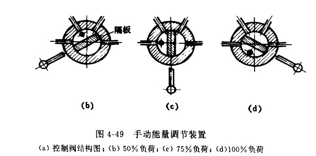 圖4-49是一種手動能量控制閥結(jié)構(gòu)圖。這種閥實際上是一個手操縱的壓力油分配閥。它有兩根分別通往不同卸載油缸的油接管。從油泵來的壓力油自供油接管進入控制閥的隔板右側(cè),操作者可根據(jù)冷負荷的不同需要,轉(zhuǎn)動手柄,使控制閥處于不同的工作位氍,讓壓力油通至不同的卸載油缸,使其所操縱的氣缸投入工作。不投入工作的卸載油缸的油管與通向曲軸箱的回油管相通。圖4-49(b)、(c)、(d)分別表明了8FSIO壓縮機以50%、75%和1OO%負荷工作時的控制閥隔板和手柄位置。