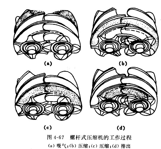 下面利用圖4-67說明螺桿式壓縮機(jī)的工作過程。