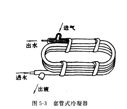 圖5-3是氟利昂套管式冷凝器,它是由兩種直徑不同的無縫鋼管和紫銅管套在一起,盤成長圓形或圓形的一種冷凝器。氟利昂蒸氣在套管空間內(nèi)冷凝,冷凝液從下面流出。冷卻水在內(nèi)管中自下而上流動,與氟利昂蒸氣的流向相反。冷卻水流速在1-2m/s之間。