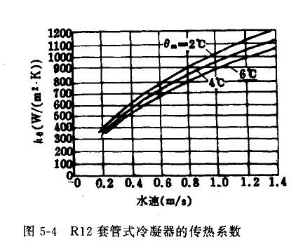 由于水在管內(nèi)流程較長,因而進(jìn)出口溫差較大,約在8-10℃之間。圖5-4是R12套管式冷凝器中冷凝時的傳熱系數(shù)。圖中口。是對數(shù)傳熱溫差。