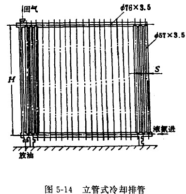 排管式蒸發(fā)器(又稱為冷卻盤管)是指管外以自由運(yùn)動(dòng)冷卻空氣的蒸發(fā)器。它主要用于各種冰箱、低溫試驗(yàn)箱及冷庫的冷藏庫房中,其結(jié)構(gòu)形式有立管式、水平管式及蛇形管式等多種。圖5-14是一種立管式冷卻排管,它是由+57mm×3.5mm或+38mm×3.Omm無縫鋼管(光管)制成,沿墻壁安裝。氨液由下橫管進(jìn)入,氮?dú)庥缮蠙M管引出。這種排管的優(yōu)點(diǎn)是捧氣排油方便。缺點(diǎn)是存氨量多,由于氨液柱高度的影響使排管下部蒸發(fā)溫度增高,傳熱溫差減小。所以這種排管不宜使用在-40℃以下的冷庫。