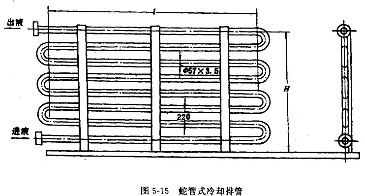 蛇管式冷卻排管可分為光管和翅片管兩種。光管式常采用+57mm×3.5mm或+38mm×3.0mm的無縫鋼管或+16mm×1.Omm的紫銅管制成。翅片管式常用繞片管制成。這種排管如圖5-15所示。它可用氨或氟利昂作為制冷荊,它的優(yōu)點(diǎn)是存液量少,僅為其排管內(nèi)容積的40%左右。它的主要缺點(diǎn)是制冷劑的流動(dòng)阻力較大。