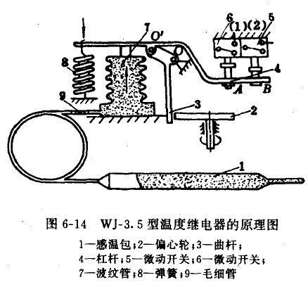 WJ-3.5型溫度繼電器的工作原理,如圖6-14所示。由感溫包l、毛細管9、波紋管7所組成的感溫機構,對杠桿4產(chǎn)生一個頂力,此頂力矩與彈簧產(chǎn)生的拉力矩相平衡,若被測介質的溫度低于調定值時,由于頂力矩小于拉力矩而使杠桿以O為支點逆時針方向轉動,杠桿將微動開關接下,可以切斷電源,停止電磁閥供液,反之,當被測介質溫度上升,則動作過程相反,使微動開關復位,使電磁閥電路導通,電磁閥開通供液。