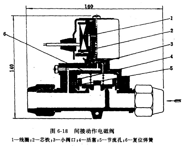 FDF-25型電磁閥是通徑為25mm的二次開啟式電磁閥,其結(jié)構(gòu)見圖6-18所示。它的工作原理是:當(dāng)線圈1接通電源時,產(chǎn)生磁場,吸起芯鐵2,小閥03被打開,使活塞上部空間與閥后相通,此空何內(nèi)的壓力迅速下降至閥后壓力,由于閥后壓力低于閥前壓力,故在活塞上下形成了一個壓力差,從而使活塞向上移動,閥門被打開I當(dāng)線圈電源被切斷時,磁力消失,芯鐵在彈簧力和自重的作用下,下落關(guān)閉小閥口,此時閥前介質(zhì)通過活塞上的平衡小孔(圖上未畫出)進入活塞上部空間.使上部空間壓力等于閥前壓力,活塞在彈簧力和自重的作用下,下移關(guān)閉閥門。