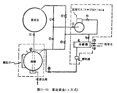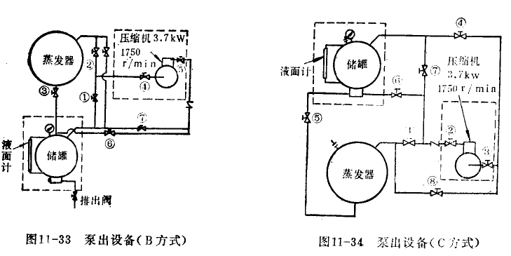 對泵出設(shè)備的流程有三種情況。圖11-32、圖11-33、圖11-34即分別表示這三種流程。圖11-32是最標準的,也是最全面的,它比圖11-33和圖11-34增加了冷凝器及浮球閥。圖11-33儲罐放在蒸發(fā)器下面,而圖11-34則相反,儲罐放在蒸發(fā)器上面。