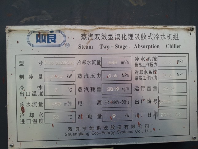 預(yù)售:兩臺(tái)225萬(wàn)大卡的雙良牌蒸汽雙效溴化鋰吸收式制冷機(jī) ,型號(hào):SXZ6-262DH2M3 制冷量:2620KW 機(jī)組運(yùn)行重量:28.6噸 生產(chǎn)日期:2011.5 機(jī)組已拆包、未使用過(guò)。