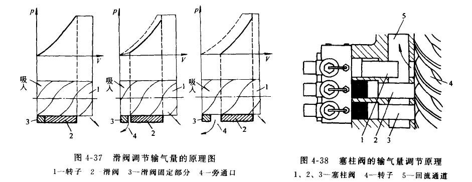 另一種調(diào)節(jié)螺桿壓縮機輸氣量的方法是采用多個塞柱閥調(diào)節(jié)。圖4-38中有三個塞柱闊,需要減少輸氣量時,將塞柱閥l打開、基元容積內(nèi)一部分制冷劑氣體就旁通到吸氣口。當(dāng)需要輸氣量繼續(xù)減少,則將塞柱閥2再打開。利用塞柱閥的啟閉實現(xiàn)輸氣量的有級調(diào)節(jié)。塞柱閥的啟閉可用油壓通過電磁閥來實現(xiàn)。塞柱閥調(diào)節(jié)輸氣量的調(diào)節(jié)負(fù)荷為75%、50%、25%等。這種調(diào)節(jié)方法在小型、緊湊型螺桿壓縮機中可以看到。采用滑閥或塞柱閥機構(gòu),除了能調(diào)節(jié)輸氣量大小外,還具有卸載起動的功能,使壓縮機在空載或低負(fù)荷下起動,改善了起動條件。