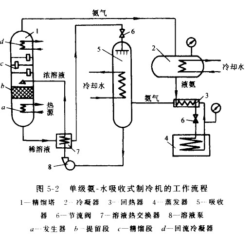倒5-2為單級氨一水吸收式制冷機(jī)工作流程圖,該制冷系統(tǒng)主要由發(fā)生器、精餾器、回流冷凝器、回?zé)崞?、?jié)流問、蒸發(fā)器、吸收器、溶液熱交換器和溶液泵等組成。濃溶液在精餾塔的提餾段中與發(fā)生器中產(chǎn)生的含水氨蒸氣接觸,進(jìn)行熱、質(zhì)交換,氮