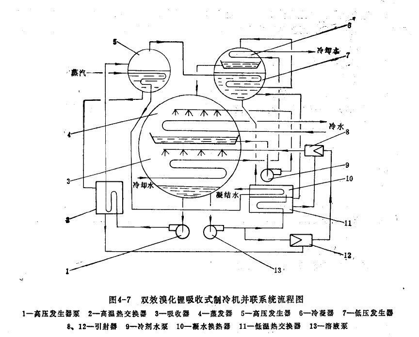 這種流程的工作過程是,由吸收器3出來的稀溶液,分為二路:一路經(jīng)高壓發(fā)生器泵1升壓后,流入高溫?zé)峤粨Q器2,溫度升高后,進(jìn)入高壓發(fā)生器5,被管內(nèi)的工作蒸汽加熱,產(chǎn)生高溫冷劑水蒸氣,溶液的濃度變濃,由高壓發(fā)生器5排出,經(jīng)高溫?fù)Q熱器2降溫后,被引射器12抽入。另一路經(jīng)溶液泵13升壓后,又分成兩路:一路經(jīng)低溫?zé)峤粨Q器11及凝水換熱器10,溫度升高后進(jìn)入低壓發(fā)生器7,在其中被高壓發(fā)生器產(chǎn)生的高溫冷劑水蒸氣加熱,產(chǎn)生冷劑水蒸氣,而高溫冷荊水蒸氣放出潛熱后凝結(jié)成冷劑水,節(jié)流后與低壓發(fā)生器產(chǎn)生的冷劑水蒸氣一起進(jìn)入冷凝器6,被管內(nèi)冷卻水冷卻和冷凝,形成冷劑水。該冷劑水節(jié)流后流入蒸發(fā)器4,由子壓力的降低,部分水汽化,剩余的冷劑水積存手水盤中,被冷劑水泵9吸入,均勻地噴淋在蒸發(fā)器管簇的外表面,吸取管內(nèi)冷媒水的熱量而蒸發(fā),使冷媒水得到冷卻(制冷),另一路作為引射器12的高壓流體,除引射由高壓發(fā)生器出來的濃溶液外,其混合液又作為引射器8的工作流體,引射由低壓發(fā)生器流出,經(jīng)低溫?zé)峤粨Q器降溫后的濃溶液,形成中間溶液后,均勻?yàn)⒘茉谖掌鞴艽赝獗砻妫沼烧舭l(fā)器產(chǎn)生的冷劑水蒸氣,從而保持蒸發(fā)器內(nèi)所需低壓,使冷劑水能在低壓、低溫下不斷蒸發(fā)而制取冷量。中間溶液吸收了冷劑水蒸氣后,重新變成稀溶液,再分別由高壓發(fā)生器泵及溶液泵送出。吸收過程中產(chǎn)生的熱