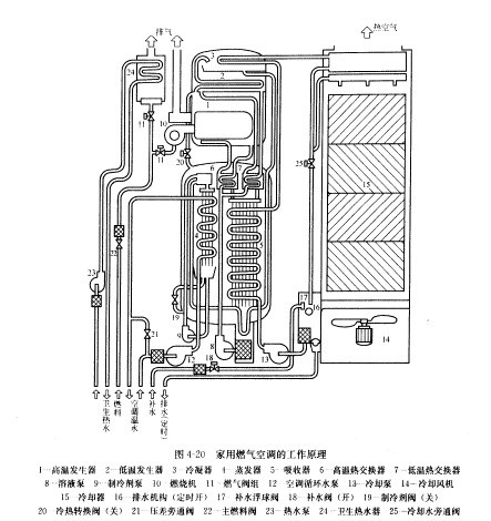 家用燃?xì)饪盏虻氖彝鈾C(jī)用溴化鋰作吸收劑,用水作制冷劑,用天然氣等燃料作熱源。4℃的制冷劑水噴灑在蒸發(fā)器管束上,使管內(nèi)14℃的空調(diào)水降溫到7℃;制冷劑水受熱后蒸發(fā),溴化鋰溶液將蒸發(fā)的水蒸氣熱鳋吸收,然后通過冷卻器將其釋放到大氣中去;稀釋的溴化鋰溶液經(jīng)過加熱濃縮,分離出水并再蒸發(fā),濃溶液再次吸收熱量。如此循環(huán)往復(fù),完成制冷。