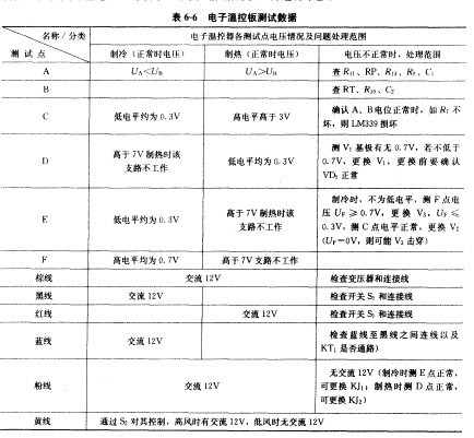 在實(shí)際維修中,應(yīng)用最多的是關(guān)鍵點(diǎn)檢查法。如圖3-44中,A、B、C、D、E、F各點(diǎn)及各色導(dǎo)線連接點(diǎn)均為主要測(cè)試點(diǎn),各點(diǎn)正常測(cè)試數(shù)據(jù)見(jiàn)表6-6。對(duì)照印制電路板中的上述各點(diǎn),檢測(cè)其對(duì)應(yīng)電壓,與表中正常測(cè)試數(shù)據(jù)比較,再進(jìn)行維修。