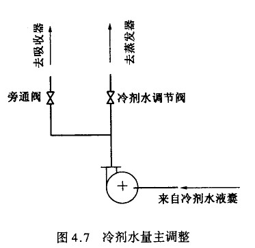 5.當(dāng)蒸發(fā)器內(nèi)冷劑水液位過(guò)高時(shí),可開(kāi)大蒸發(fā)器泵的出口閥,加大冷劑水的循環(huán)量,如果冷劑泵與吸收器之間有旁通管時(shí),可打開(kāi)冷劑水旁通閥,以減少通往蒸發(fā)器的冷劑水量(如圖4.7所示),或減少高壓發(fā)生器的液位,或降低蒸汽壓力來(lái)進(jìn)行調(diào)整;如果機(jī)組內(nèi)有不凝性氣體而造成冷荊水的過(guò)多,除采取以上方法外還應(yīng)開(kāi)啟真空泵,將不凝性氣體抽出機(jī)外,以穩(wěn)定冷劑水的水位。