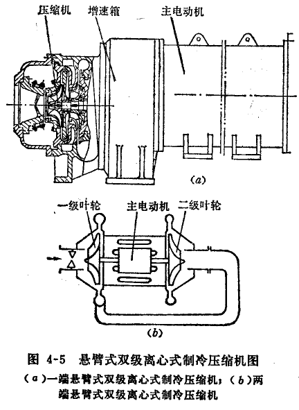 六十年代初期,世界上多采用這種型式。很顯然,其缺點(diǎn)是總體結(jié)構(gòu)松散,占地面積大,維護(hù)管理亦欠方便。目前,在工業(yè)上和低溫工況的多級(jí)離心式制冷機(jī)產(chǎn)品中,仍然采用。