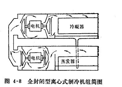 指整個(gè)制冷機(jī)組封閉在同一殼體內(nèi)。一般用于小型空調(diào)用離心式制冷機(jī)組,優(yōu)點(diǎn)是氣密性好,取消增速裝置因而結(jié)構(gòu)簡(jiǎn)單,噪聲低,振動(dòng)小,外觀單一(見圖4-8)。