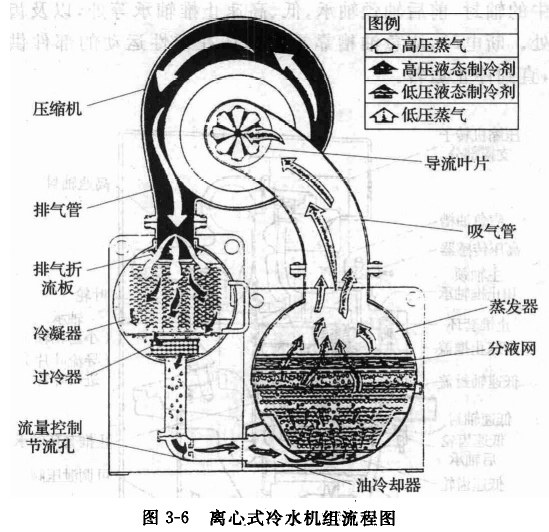 液體制冷劑經(jīng)過節(jié)流孔板進(jìn)入蒸發(fā)器下部的分液槽,并經(jīng)過滿布小孔的分液板,均勻迸液,吸收冷凍水的熱量汽化,氣體離開蒸發(fā)器前,分液網(wǎng)將它夾帶的液滴分離,然后進(jìn)入離心式制冷壓縮機(jī),壓縮后的氣體進(jìn)入冷凝器,在冷凝器中冷卻、冷凝,并過冷。其系統(tǒng)流程圖如圖3-6所示。