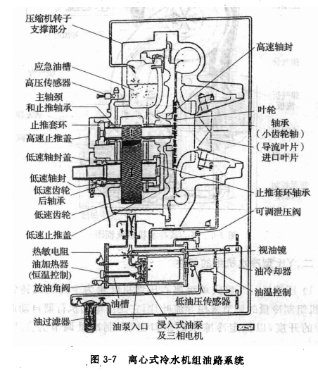 2)壓縮機(jī)的潤(rùn)滑系統(tǒng)(見圖3-7) 它由油泵、油過濾器、油冷卻器和油璐等組成。油泵為浸入式放在油槽內(nèi),按下壓縮機(jī)啟動(dòng)開關(guān),油泵立刻啟動(dòng),延時(shí)50s,待油壓穩(wěn)定后,壓縮機(jī)才啟動(dòng)。在壓縮機(jī)運(yùn)行中或停機(jī)減速的150s中,油泵都在工作,潤(rùn)滑油被油泵吸入后,被排至油冷卻器冷卻,經(jīng)濾油器,迸入應(yīng)急油槽(高位油箱),然后被分到需要潤(rùn)滑的部位,如低、高速驅(qū)動(dòng)軸中的軸封,前后軸頸軸承,低、高速止推軸承等處,以及齒輪嚙合處。斷電時(shí),應(yīng)急油槽靠重方向還在慣性運(yùn)動(dòng)的部件供油潤(rùn)滑,直到停止運(yùn)轉(zhuǎn)。