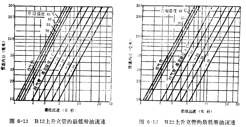 最后指出,制冷壓縮機(jī)排氣管路的設(shè)計(jì)也應(yīng)考慮攜帶潤滑油問題,氟利昂12和22排氣管路的最低帶油流速見圖6-12和圖6-13。