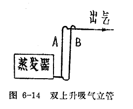 圖6-14為雙上升吸氣立管布置圖。其中A管為小口徑管道,它應(yīng)保證最低負(fù)荷時能夠攜帶潤滑油。A和B兩根立管同時工作,保證滿負(fù)荷運(yùn)行,此時,全部吸氣管的壓力損失應(yīng)不超過希望的限度,同時又能保證帶油。在變負(fù)荷情況下運(yùn)行,兩個立管同時工作,氣流速度不足以帶油上升時,B管下部的油封將逐漸被充滿,直至B管被隔斷,僅靠A管工作。為了避免單管工作時,可能有潤滑油不斷地進(jìn)入未工作的立管,兩管均應(yīng)從上部與水平管相接。