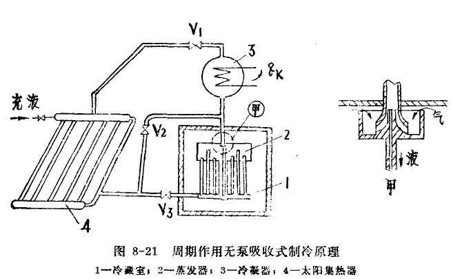 圖8-21是利用太陽(yáng)能的周期作用無(wú)泵吸收式制冷原理圖。太陽(yáng)集熱器4內(nèi)裝有一定濃度的制冷劑-吸收劑溶液。白晝有日照時(shí),太陽(yáng)集熱器用作為發(fā)生器,開(kāi)啟閥門Vl,關(guān)閉閥門V2、V3,進(jìn)行溶液的沸騰過(guò)程(即發(fā)生過(guò)程)。溶液在太陽(yáng)集熱器內(nèi)受熱,升溫至沸點(diǎn)后在定壓下沸騰,氣態(tài)制冷劑從其中蒸發(fā)出來(lái),進(jìn)入冷凝器3冷凝成液態(tài),貯入蒸發(fā)器2內(nèi),而太陽(yáng)集熱器中的溶液則逐漸變濃(以含吸收劑數(shù)量而言)。夜間,太陽(yáng)集熱器用作吸收器,開(kāi)啟閥門V2,關(guān)閉閥門V1、V3,進(jìn)行制冷過(guò)程(即吸收過(guò)程)。集熱器對(duì)天空進(jìn)行輻射,溶液溫度逐漸下降,因而整個(gè)系統(tǒng)中的壓力逐漸下降,蒸發(fā)器內(nèi)制冷劑的飽和溫度也相應(yīng)降低。當(dāng)該溫度降至低于冷藏室1的溫度時(shí),蒸發(fā)器內(nèi)的液態(tài)制冷劑開(kāi)始吸取冷藏室的熱量變成氣態(tài),從而達(dá)到制冷的目的。蒸發(fā)器內(nèi)形成的氣態(tài)制冷劑通過(guò)閥門V2進(jìn)入吸收器,被其中的濃溶液吸收,溶液逐漸變稀,以再次進(jìn)行沸騰過(guò)程和制冷過(guò)程。