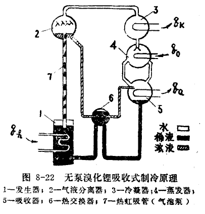 圖8-22為無(wú)泵溴化鋰吸收式制冷機(jī)的原理圖。由于吸收器5的壓力低于發(fā)生器1的壓力,故兩者應(yīng)有一定的高度差,才能保證稀溶液自流進(jìn)入發(fā)生器。稀溶液在發(fā)生器內(nèi)受熱沸騰,靠熱虹吸管7將水蒸汽和濃溶液的混合物一起提升至氣液分離器2。經(jīng)分離器分液后的高壓過(guò)熱水蒸汽進(jìn)入冷凝器3,蒸發(fā)器4進(jìn)行制冷,而分離出來(lái)的濃溶液積存在分離器的下部,靠高度差流經(jīng)熱交換器6,再進(jìn)入吸收器,吸收來(lái)自蒸發(fā)器的低壓冷劑水蒸汽。這種無(wú)泵溴化鋰吸收式制冷機(jī)靠熱虹吸管輸送溶液,簡(jiǎn)化了制冷裝置。但是,它的熱力系數(shù)受熱媒溫度影響較大,熱媒溫度過(guò)高或過(guò)低均使其熱力系數(shù)急劇降低。此外,它的制冷能力較小,目前國(guó)外最大者,制冷量約25000kcal/h。