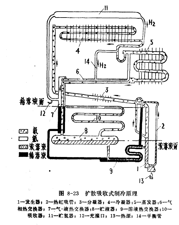 擴(kuò)散式氨-水吸收式制冷機(jī)的工作原理如圖8-23所示。該系統(tǒng)是由氨循環(huán)、氨-水溶液循環(huán)
