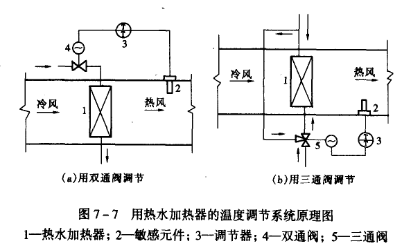 為了使熱水加熱器后的風(fēng)溫恒定,可以用如圖7-7所示的調(diào)節(jié)系統(tǒng)來實現(xiàn)。圖7-7a中用雙通閥來調(diào)節(jié),圖7-7b中用三通閥來調(diào)節(jié)。當(dāng)雙通閥4改變熱水流量的同時,將使供水干管的總流量發(fā)生變化,導(dǎo)致干管的靜壓也發(fā)生變化,會影響同一水路系統(tǒng)內(nèi)其他熱水加熱器的正常工作,這是該種調(diào)節(jié)方法的缺點。為了克服這個缺點,可以通過壓力調(diào)節(jié)器來保持水路系統(tǒng)的靜壓恒定。但更常用的方法是用三通閥來代替雙通閥,使得一部分熱水通過加熱器,另一部分熱水通過旁通管。通過改變這兩部分水流量的比例,來適應(yīng)負荷的需求,這種方法能保持供水干管的總流量不變,因而使供水干管上的靜壓穩(wěn)定,但不利于節(jié)能。