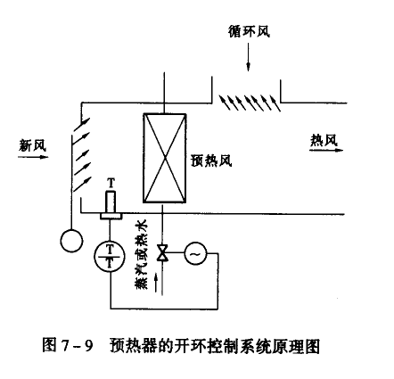 如系統(tǒng)是閉環(huán)調(diào)節(jié),則溫度敏感元件設(shè)在預(yù)熱器后面,通過調(diào)節(jié)預(yù)熱器的加熱量,來自動維持預(yù)熱器后的風(fēng)溫恒定,由于設(shè)置了預(yù)熱器,使第一次加熱器的加熱量減少。如果第一次加熱器是利用位式或比例調(diào)節(jié)器控制,則由于加熱器容量的減少,可以提高調(diào)節(jié)品質(zhì)。同時,由于對預(yù)熱器后空氣溫度的控制,也可以減少由于室外新風(fēng)溫度變化對調(diào)節(jié)品質(zhì)的影響。預(yù)熱器的開環(huán)控制系統(tǒng),如圖7-9所示。由于直接利用室外空氣溫度作為控制信號,所以在預(yù)熱器后風(fēng)溫還未發(fā)生顯著的變化之前,就提前對預(yù)熱器施加調(diào)節(jié)作用,因此,這種系統(tǒng)屬于前饋調(diào)節(jié)系統(tǒng)。
